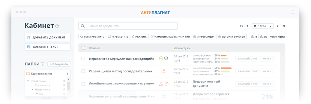 Антиплагиат проверяет тексты документов по миллионам открытых источников в интернете, а также по специальным коллекциям научных документов и архивам литературы